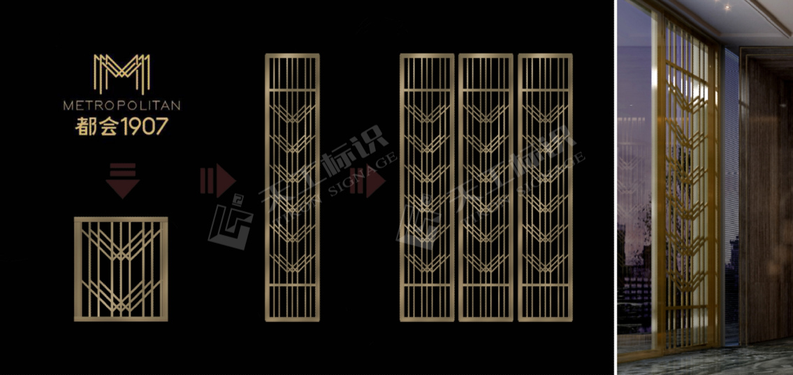 設(shè)計(jì)提取了項(xiàng)目?jī)?nèi)裝中出現(xiàn)的極具項(xiàng)目代表性的簡(jiǎn)潔金屬線條,由于其自帶光澤質(zhì)感,能夠彰顯項(xiàng)目格調(diào)。