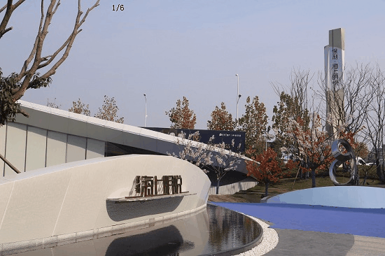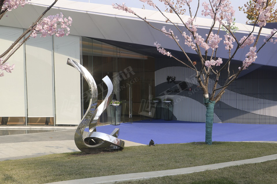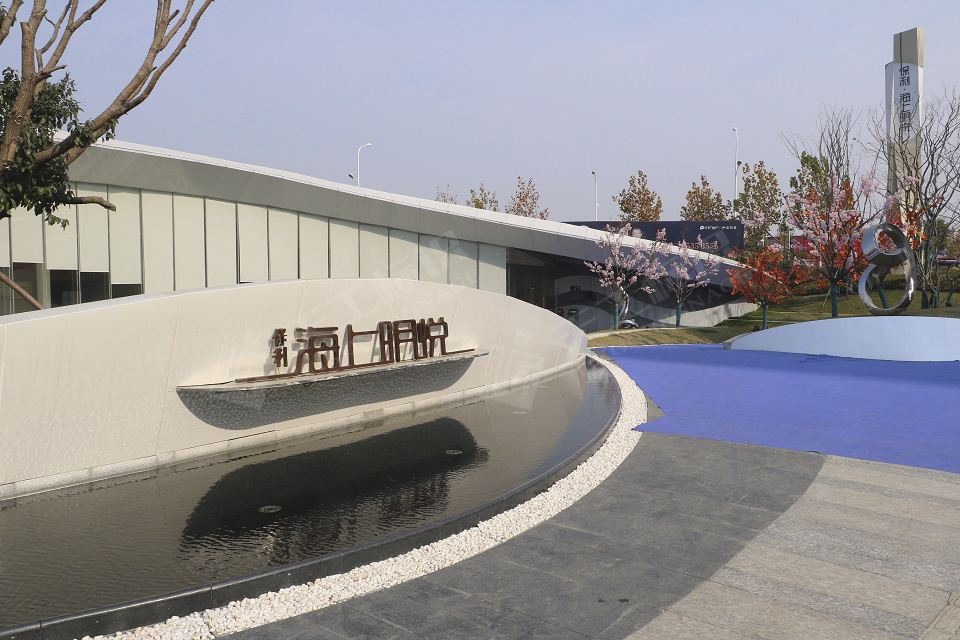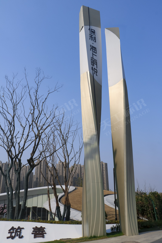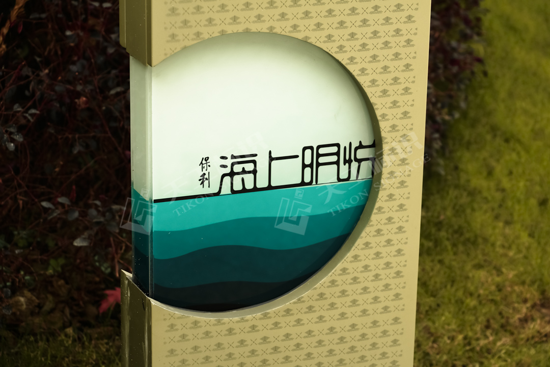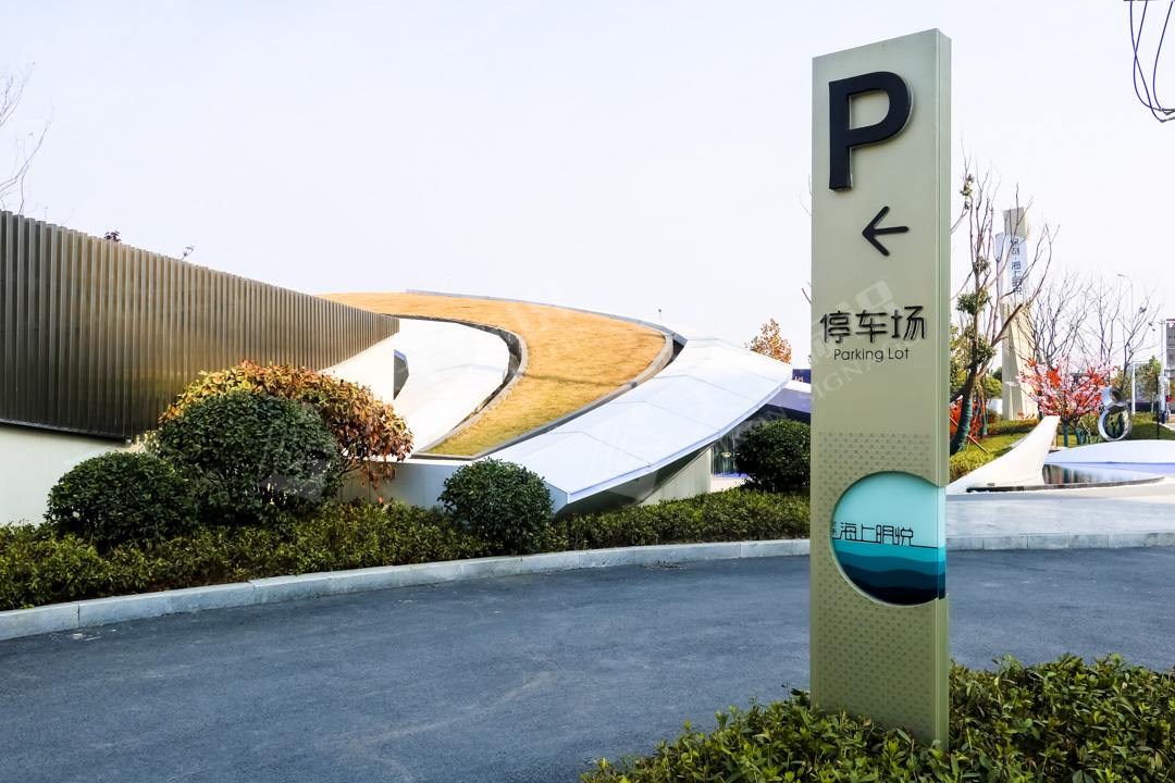 戶外指示牌采用簡約的設(shè)計手法,以金屬與鋼化玻璃搭配,配合內(nèi)部噴砂技術(shù)渲染“春江潮水連海平,海上明月共潮生”的自然氛圍。