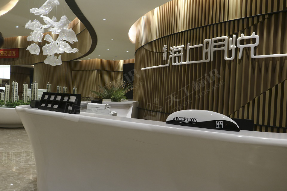 室內(nèi)標(biāo)牌主要以通透的石材和深色的金屬底座搭配,石材表現(xiàn)明月的透亮,深色金屬像藏起明月的遠(yuǎn)山。