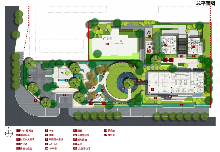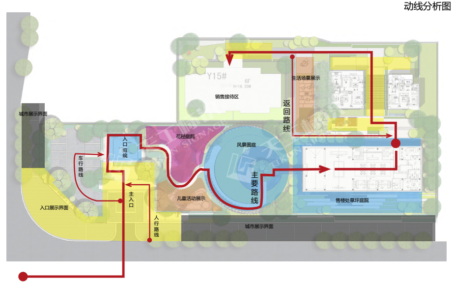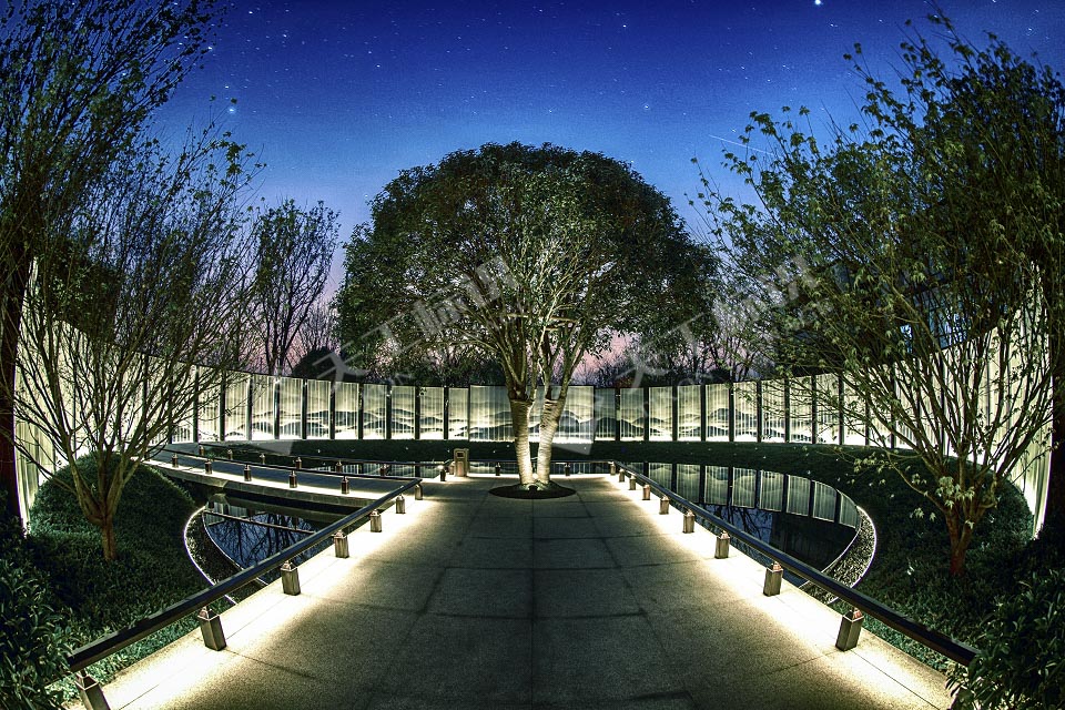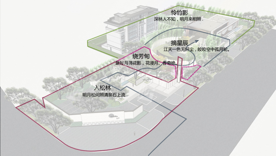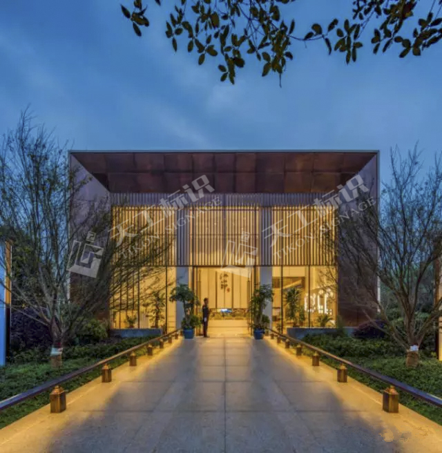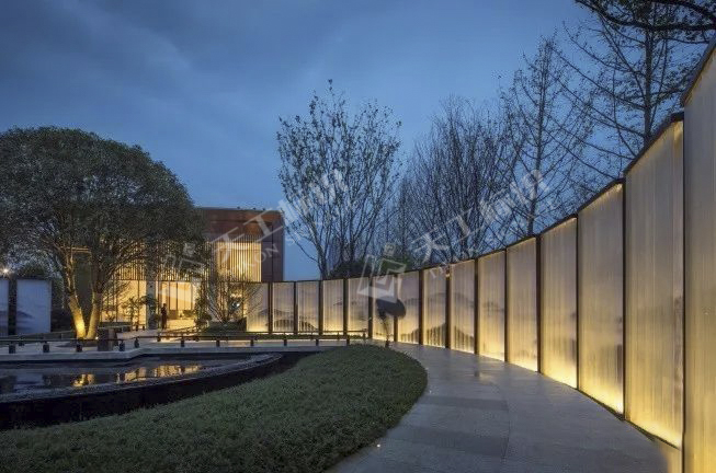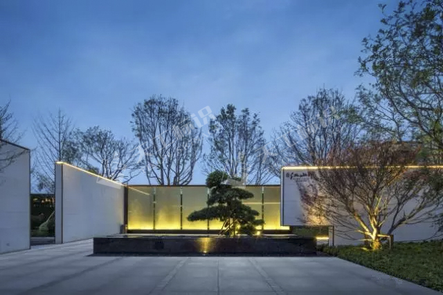 針對場地較為工整且缺乏變化、進(jìn)深較小的特點景觀公司在前場設(shè)計中采用分段式的空間劃分,并且采用具有一定高度的簡潔的景墻來分割空間,形成迂回曲折,移步易景的景觀空間,營造富有節(jié)奏感的流線空間,增強場景帶入感,并利用空間中的景觀元素形成各個節(jié)點的良好展示效果。