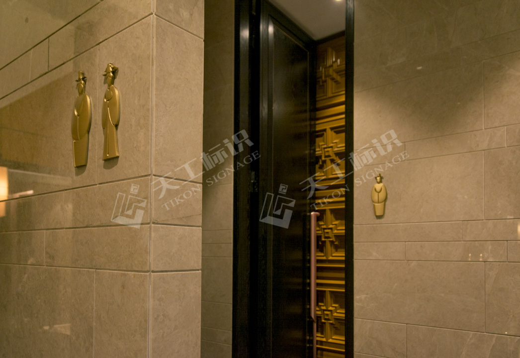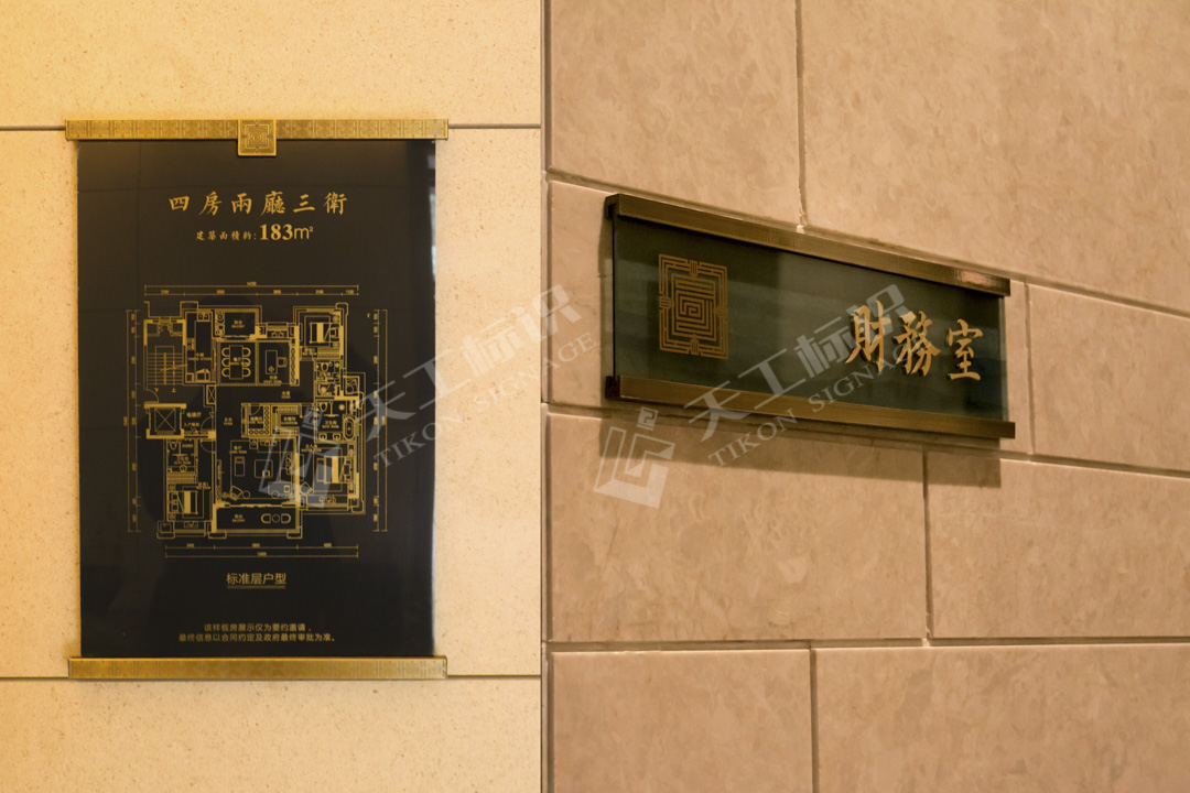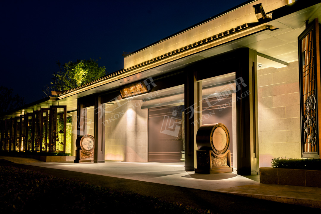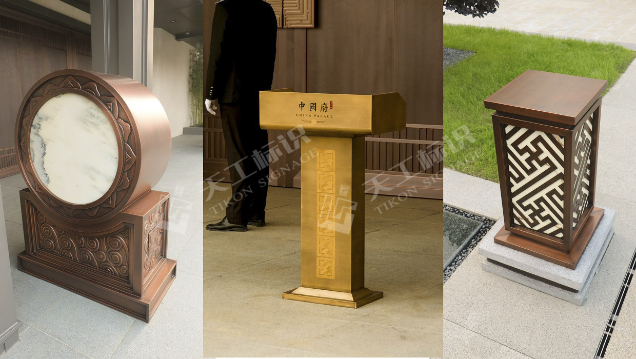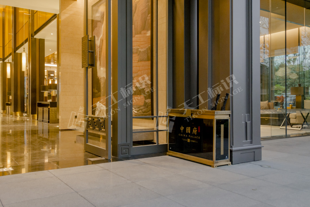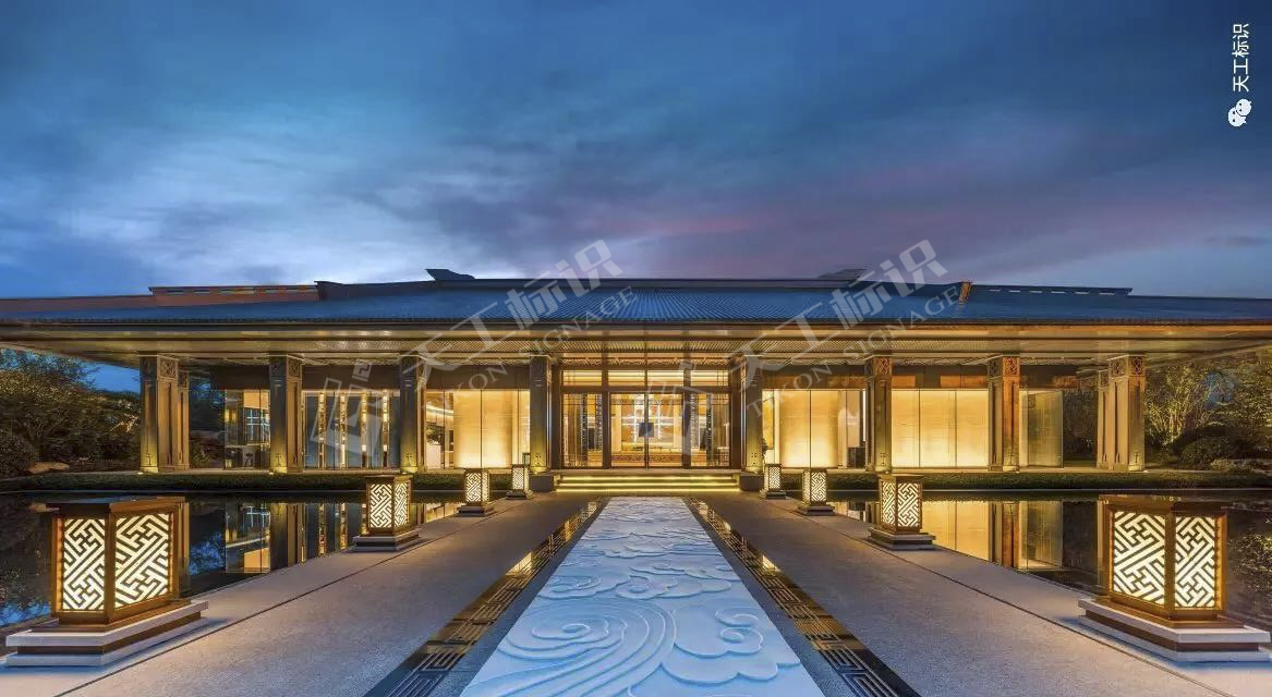 本次標(biāo)識結(jié)合建筑景觀整體風(fēng)格,去除濃墨重彩的色調(diào),將中式元素中的印章與鏤空雕花融合黃銅做舊與現(xiàn)代化玻璃材質(zhì),在細(xì)節(jié)之處彰顯皇家典范。