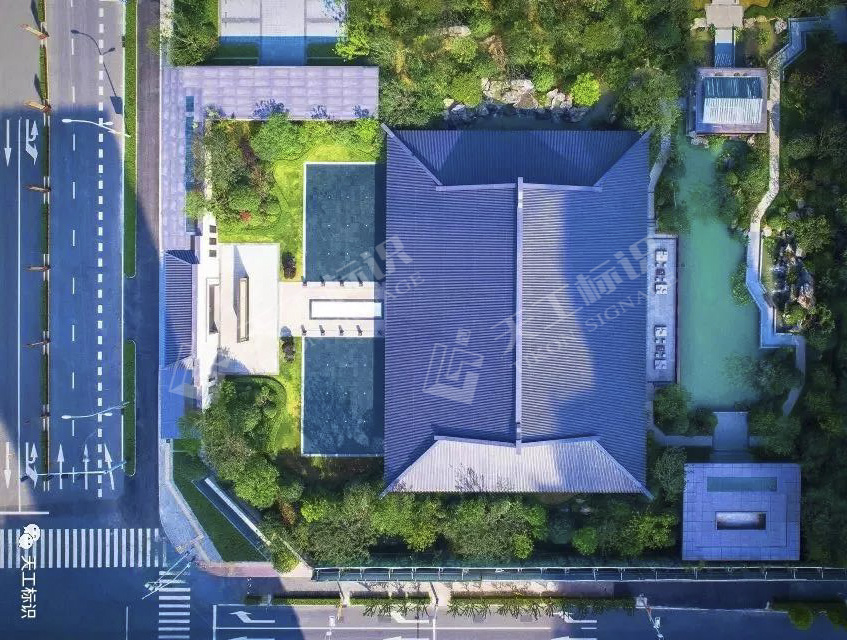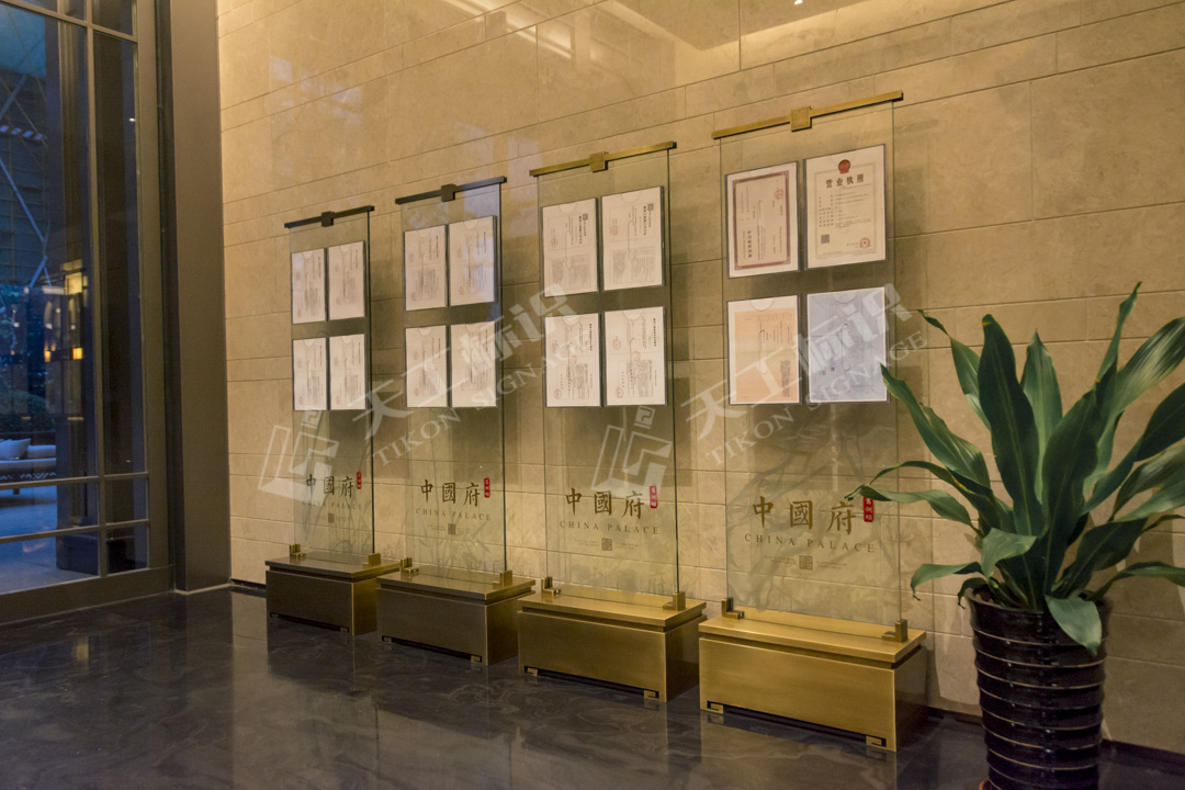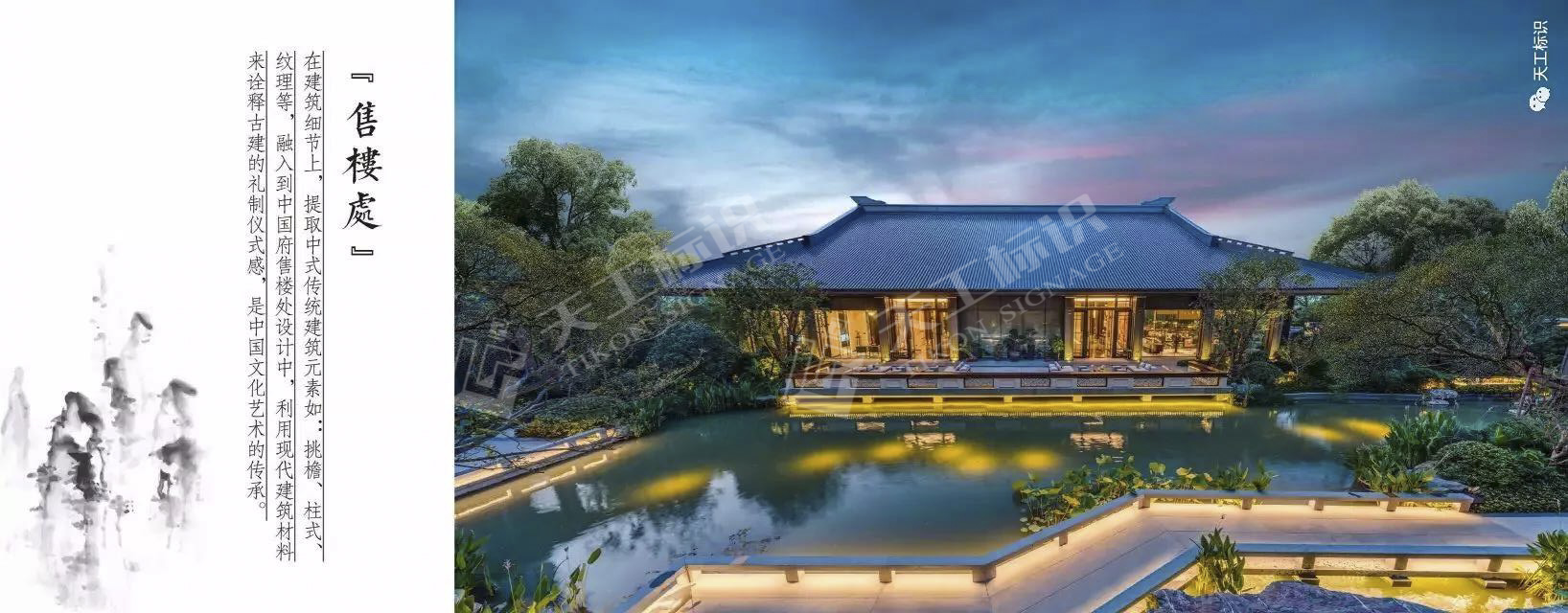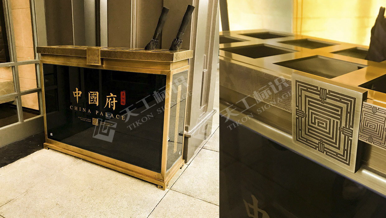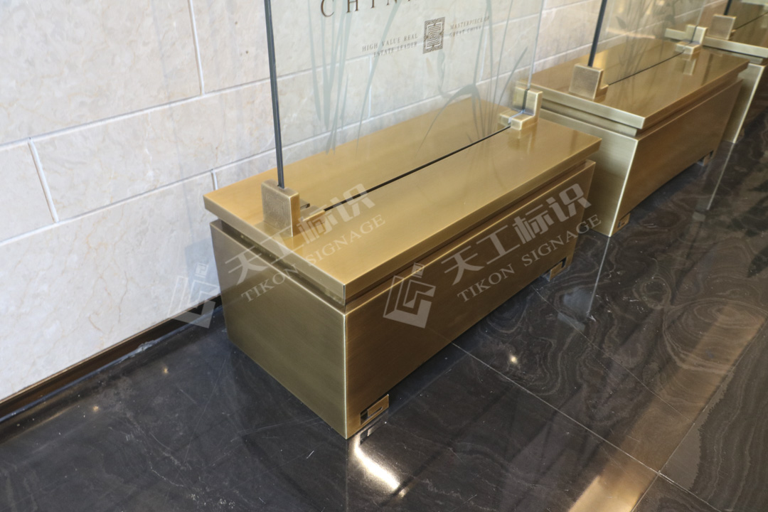 本次標(biāo)識結(jié)合建筑景觀整體風(fēng)格,去除濃墨重彩的色調(diào),將中式元素中的印章與鏤空雕花融合黃銅做舊與現(xiàn)代化玻璃材質(zhì),在細(xì)節(jié)之處彰顯皇家典范。