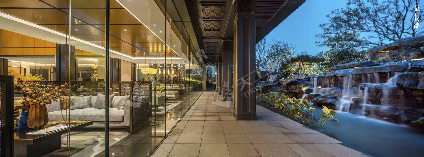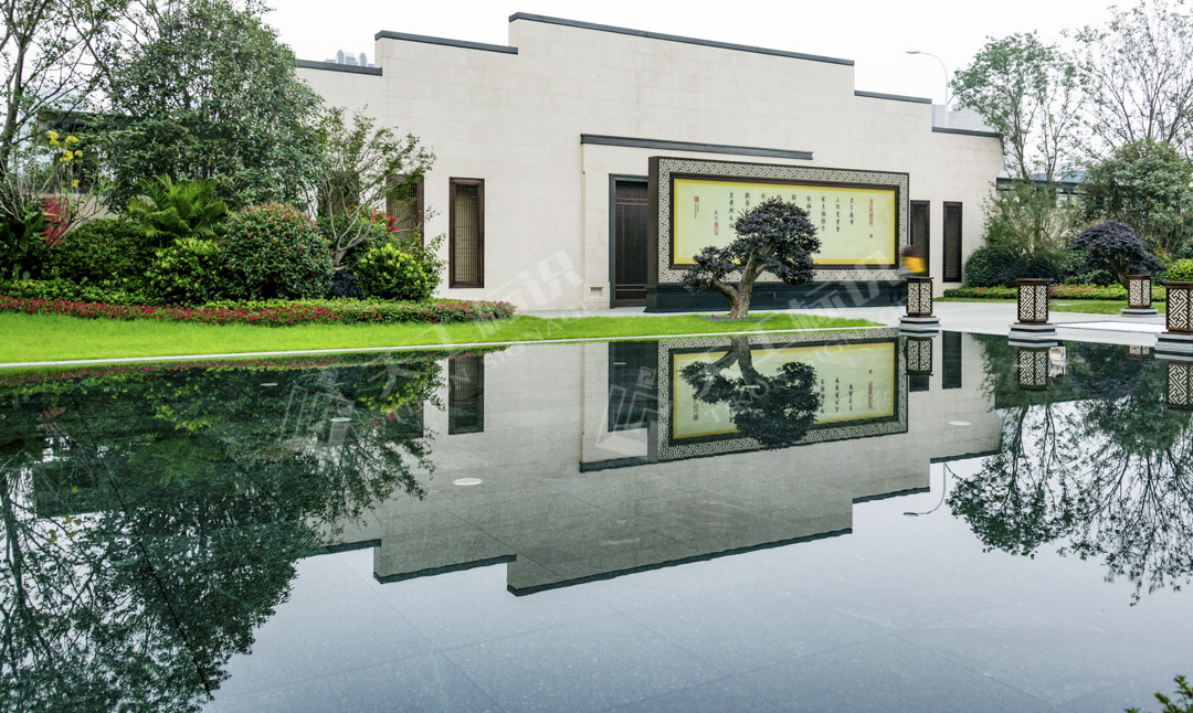 從大門到售樓部的區(qū)域,繞過照壁,最外圍的景觀、兩側(cè)的鏡面水景、菱格形路燈、中間漢白玉地雕,沿中軸對稱,滿滿的尊貴典雅。
